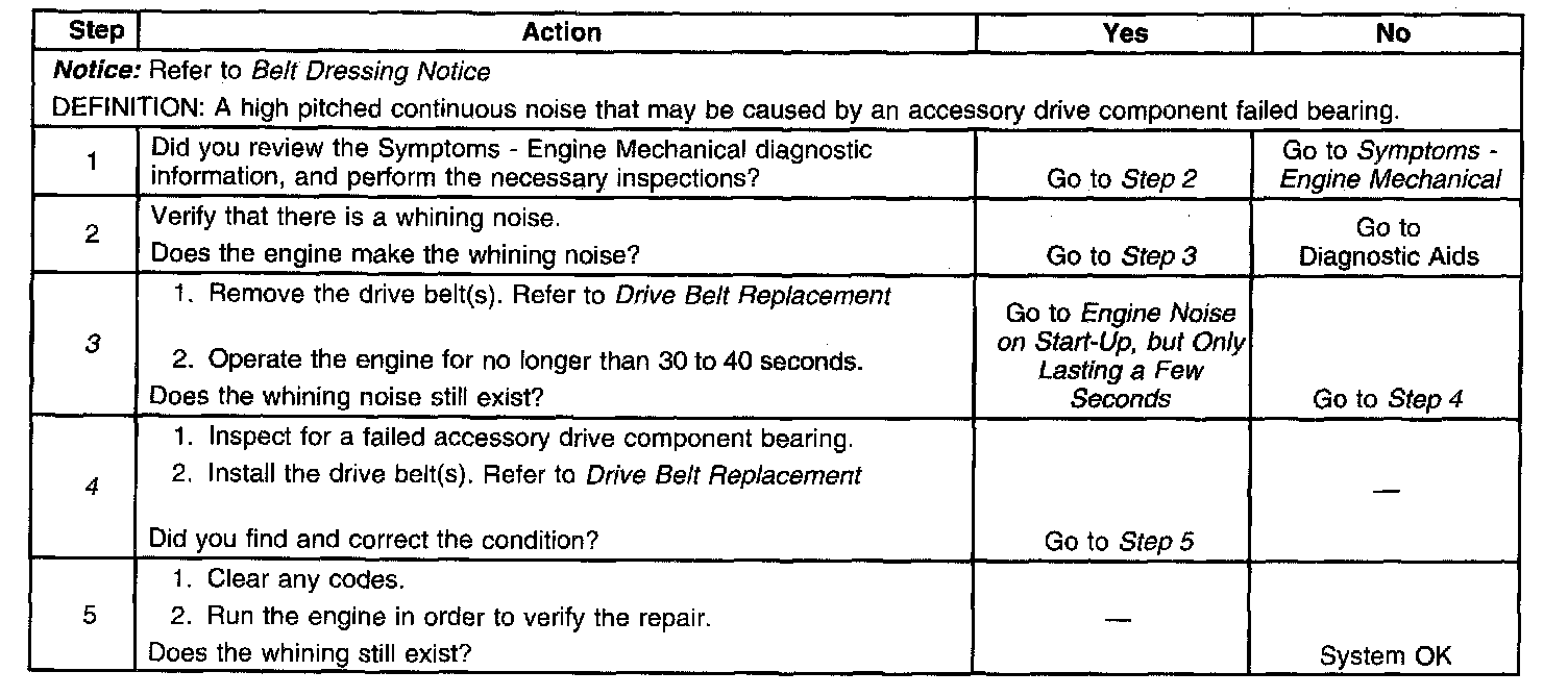 3. This test is to verify that the whine is being caused by the accessory drive component(s). Remove the drive belt(s) and operate the engine for a few seconds, this will verify if the whining noise is related to the accessory drive component. With the drive belt(s) removed the water pump will not operate and the engine may overheat. Also Diagnostic Trouble Codes (DTCs) may set when the engine is operated with the drive belt(s) removed.