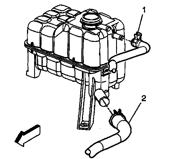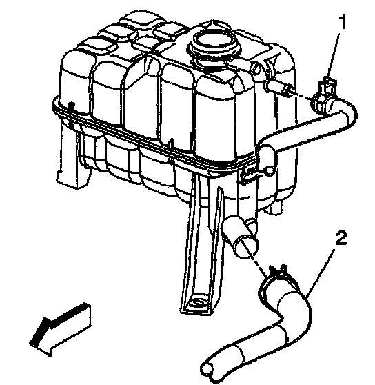 6. If equipped with a 4.3L, 4.8L, 5.3L, 6.0L, or 8.1L engine, remove the surge tank inlet (1) and outlet (2) hoses from the surge tank.