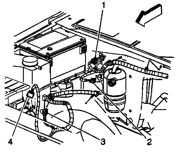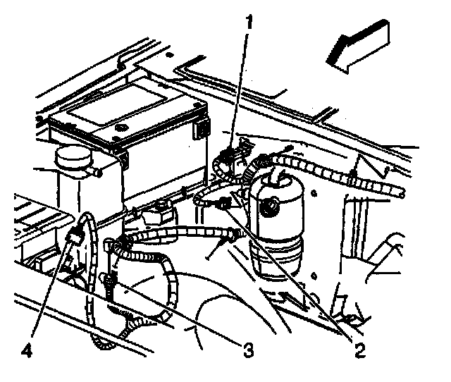 4. If equipped with a 6.6L engine, install the surge tank inlet hose (1) to the surge tank.,