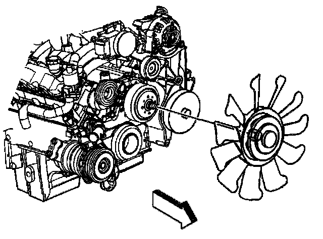 6. If equipped with a 4.3L, 4.8L, 5.3L, or 6.0L engine, remove the fan clutch bolts from the rear of the fan blade.
