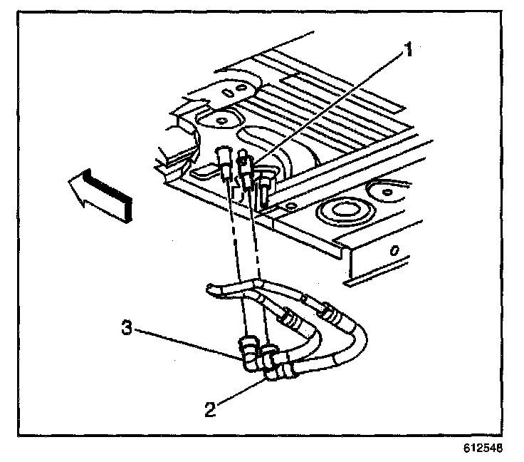 13. Install the heater lines (2, 3) to the auxiliary HVAC module at the underside of vehicle.