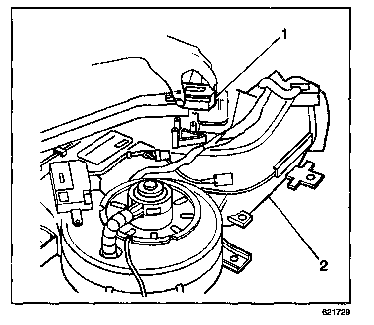 12. Remove the fastener (5) for the upper auxiliary air duct (1). Carefully slide the duct up, into the headliner, until the bottom edge of the duct is above the air distributor duct.