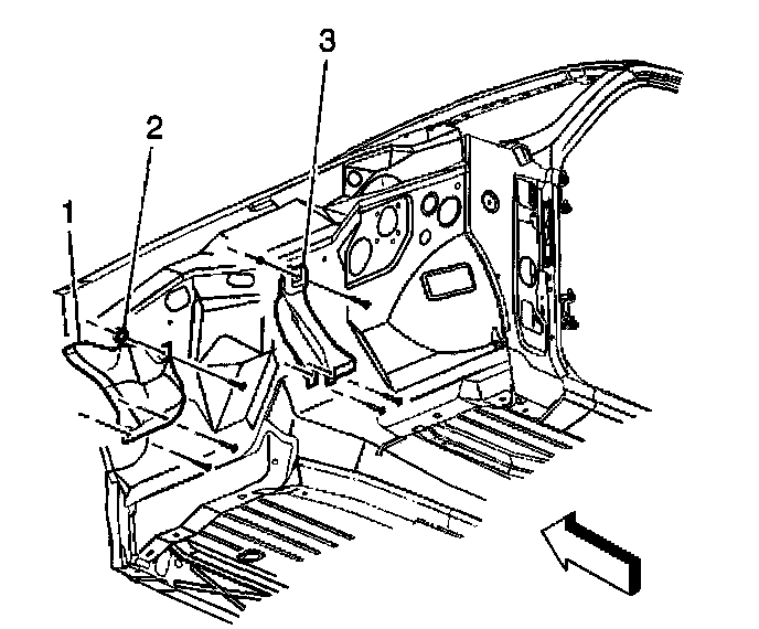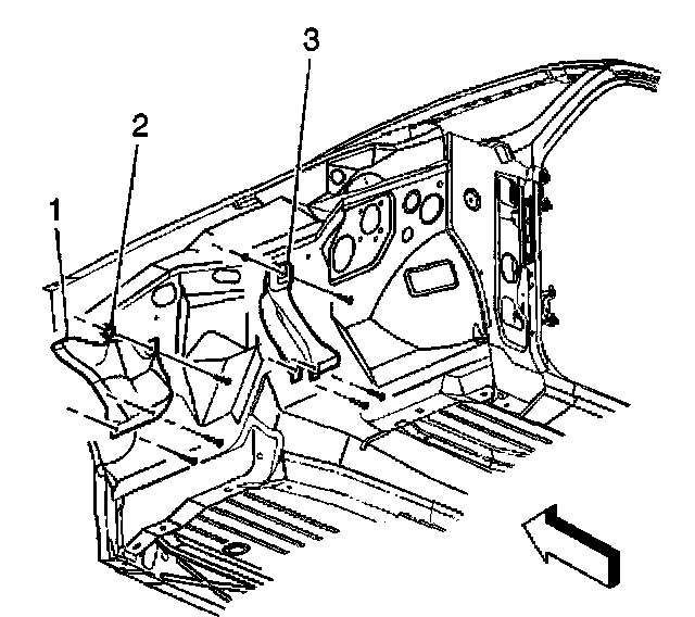 1. Install the exhaust heat shield (1, 3) to the dash panel studs.