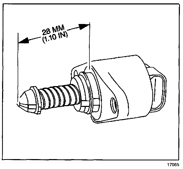 1. Measure the distance between the tip of the IAC valve pintle and the mounting surface (1). If the distance is more than 28 mm (1.1 in) use finger pressure to slowly retract the pintle. The force required to retract the pintle of a new valve does not cause damage to the valve.