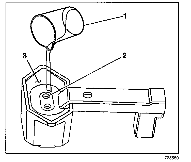 9. Pour the fuel sample from the beaker (1) into the J 44175, until the level of the fuel is at the top of each fuel test port (2).