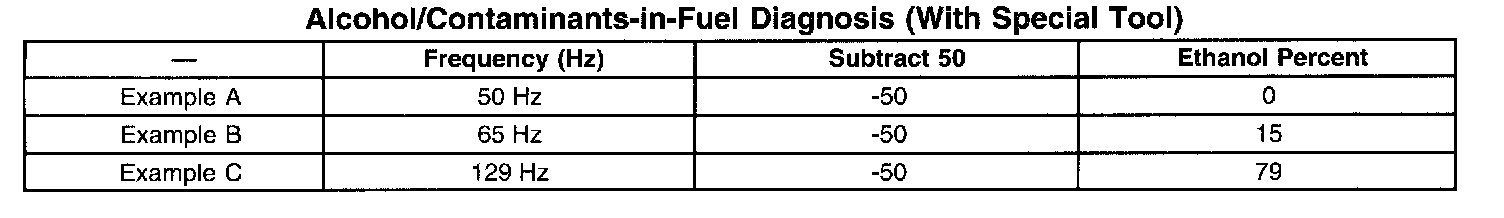 12. Subtract 50 from the reading on the DMM to obtain the percentage of alcohol in the fuel sample. Refer to the examples in the table.
