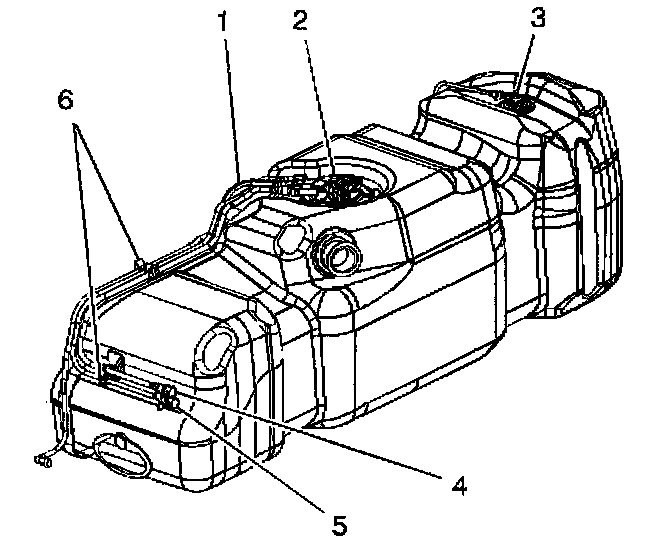 2. Connect the rear fuel feed pipe (4) and the rear fuel return pipe (5) to the fuel sender (2) and the fuel tank clips (6).