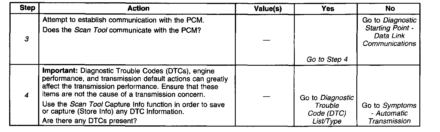 ^ Poor engine performance can sometimes be diagnosed as a transmission driveability condition. In order to avoid misdiagnosis of the automatic transmission, always perform the Diagnostic System Check - Engine Controls in Engine Controls - 4.3 L or Diagnostic System Check Engine Controls in Engine Controls - 4.8 L, & 3.0 L and 6.0 L.