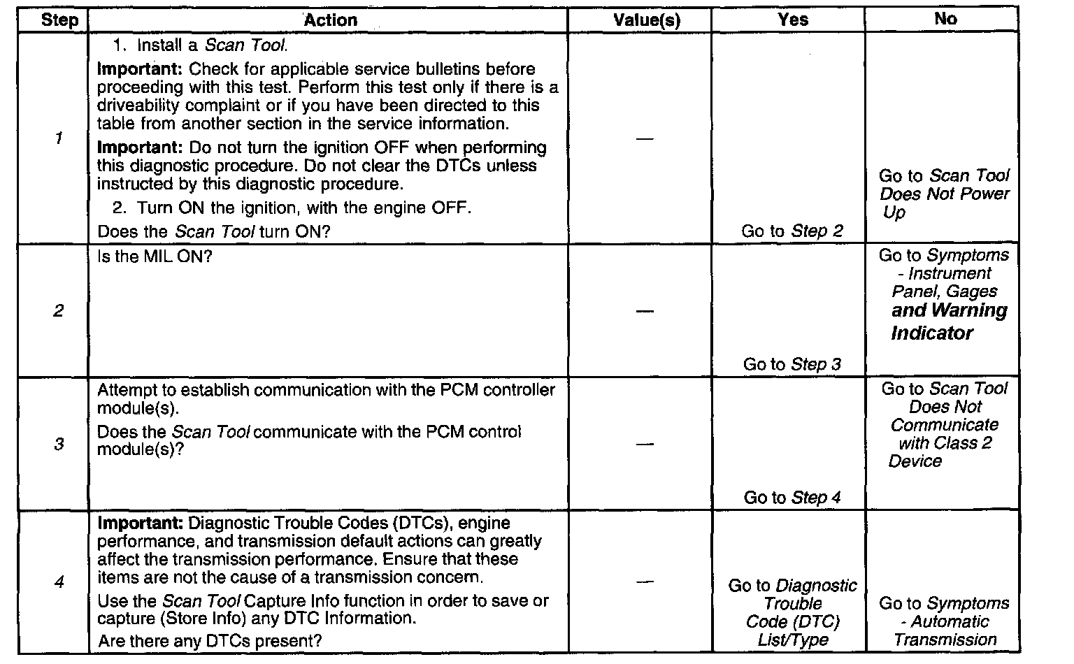 The Automatic Transmission Diagnostic System Check is an organized approach to identify a problem created by an automatic transmission. The Diagnostic System check is the diagnostic starting point for an automatic transmission complaint. The Diagnostic System Check directs you to the next logical step for diagnosing a transmission concern. Perform this check only if there is a driveability complaint or if you have been directed here from another service information.