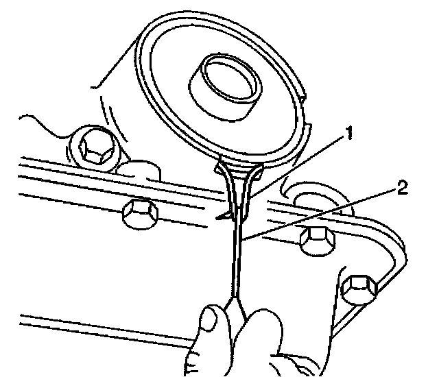 8. Remove the servo cover and the O-ring seal. If the cover is hung up on the seal, use a pick (2) to pull and stretch the seal (1) out of the groove. Cut and remove the O-ring seal before removing the cover.