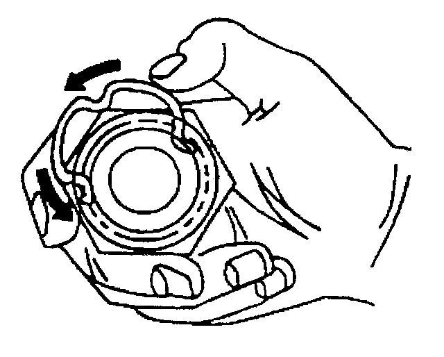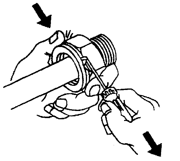 6. Pull on the open ends of the retaining ring in order to rotate the retaining ring around the quick connect fitting until the retaining ring is out of the fitting. Discard the retaining ring.