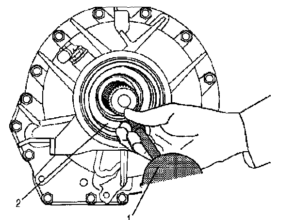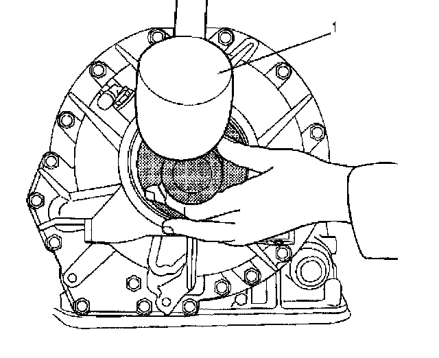 2. Slide the installer tool over the output shaft until the seal enters the seal bore. Strike the installer tool with a mallet (1) to drive the seal into the seal bore. The seal is installed correctly when the shoulder of the installer tool squarely contacts the outer surface of the rear cover.
