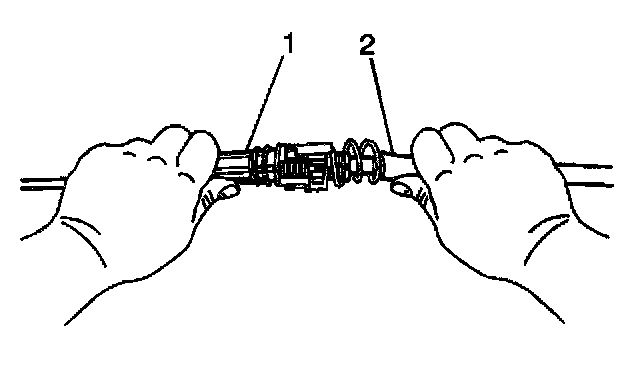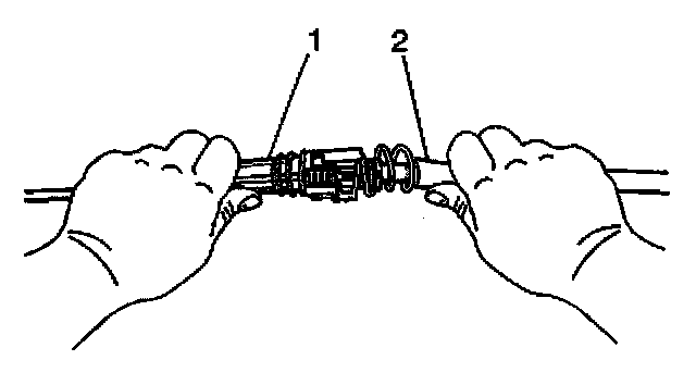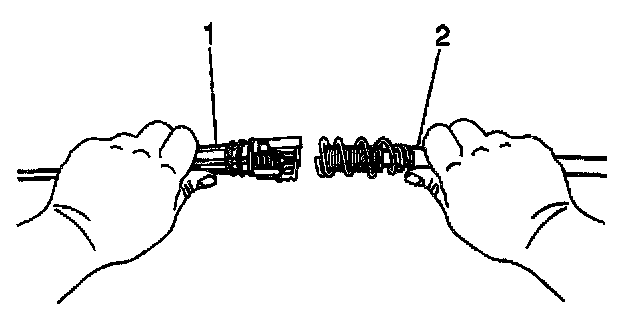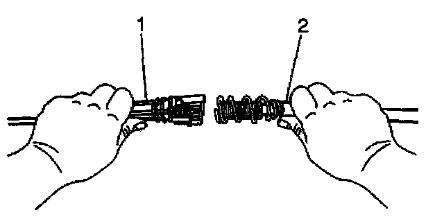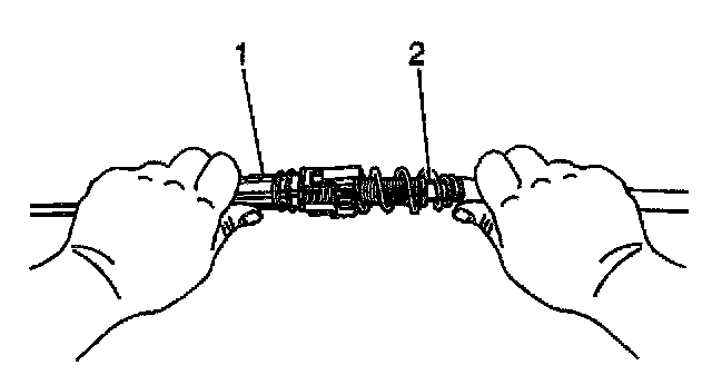 15. Grasp the front half (cab end) of the transmission cable (1) in the left hand and the rear half (transmission end) of the transmission cable (2) in the right hand.