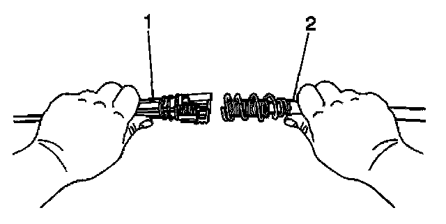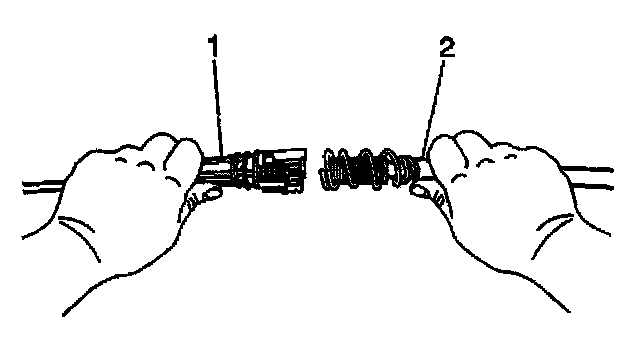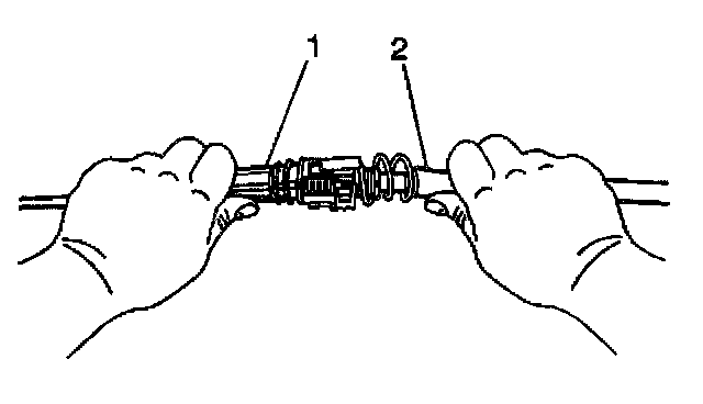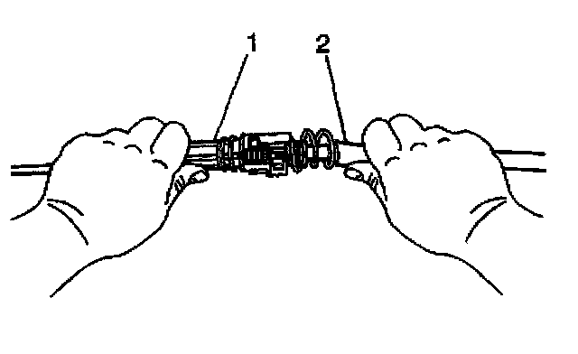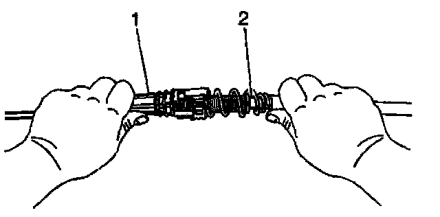 15. Grasp the front half (cab end) of the transmission cable (1) in the left hand and the rear half (transmission end) of the transmission cable (2) in the right hand.
