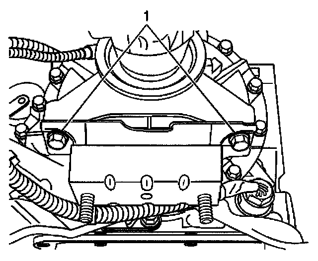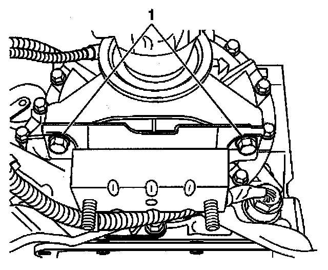5. Remove the bolts (1). Raise the transmission just enough to remove the transmission mount from the vehicle.
