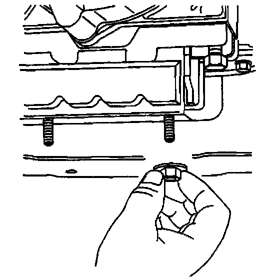 3. Lower the transmission and install the two nuts securing the transmission mount to the transmission support.