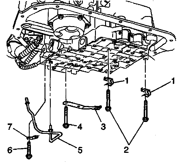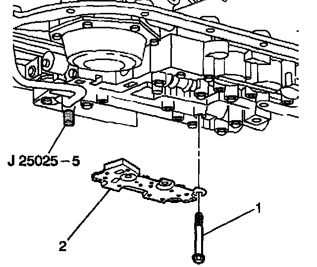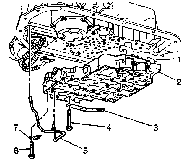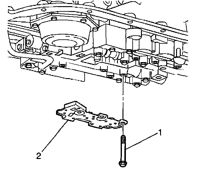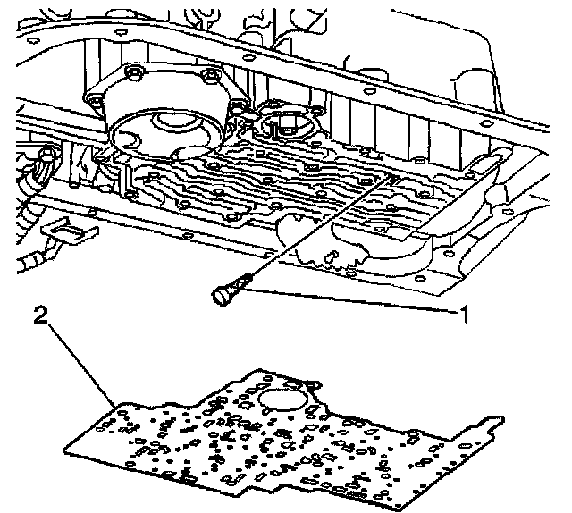 1. Remove the Transmission Fluid Pressure (TFP) manual valve position switch bolts (1) and the TFP valve position switch (2).