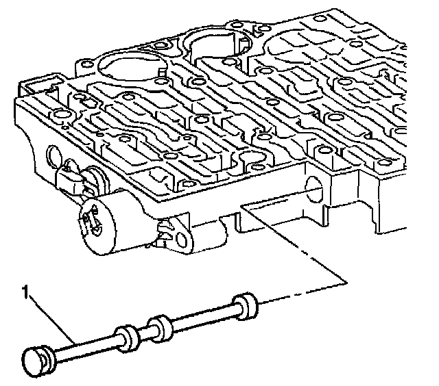 11. Remove the accumulator valve bore plug retainer pin (1).
