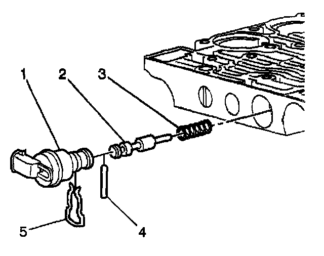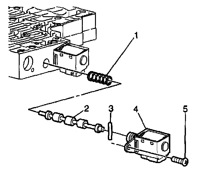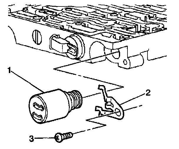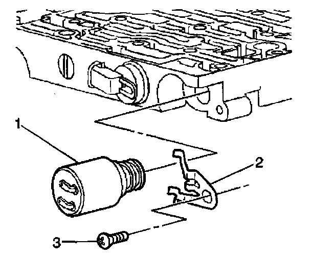 1. Remove the pressure control solenoid clamp bolt (3) and clamp (2).