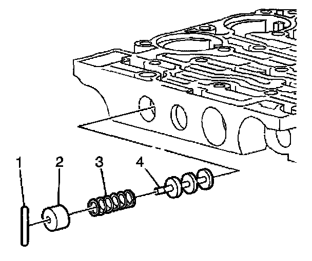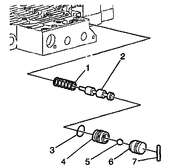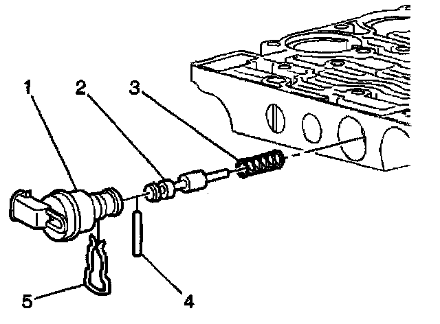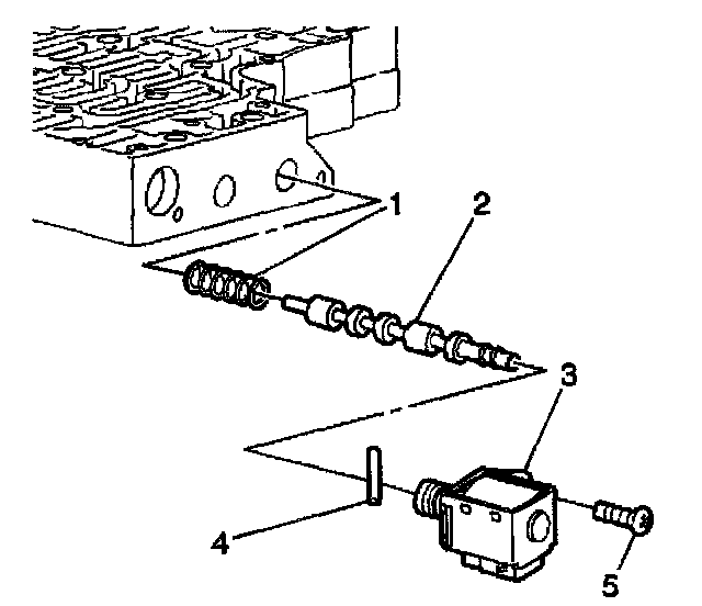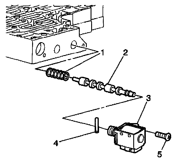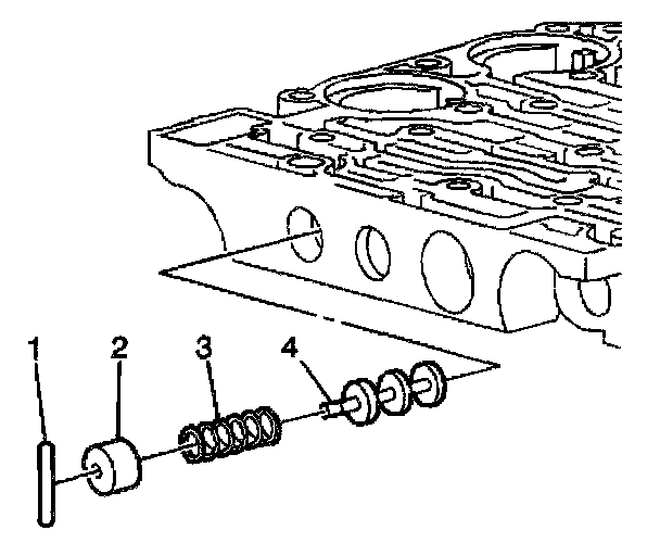 5. Remove the TCC regulator apply valve pin (4). Use a drill bit to remove the spring pin.