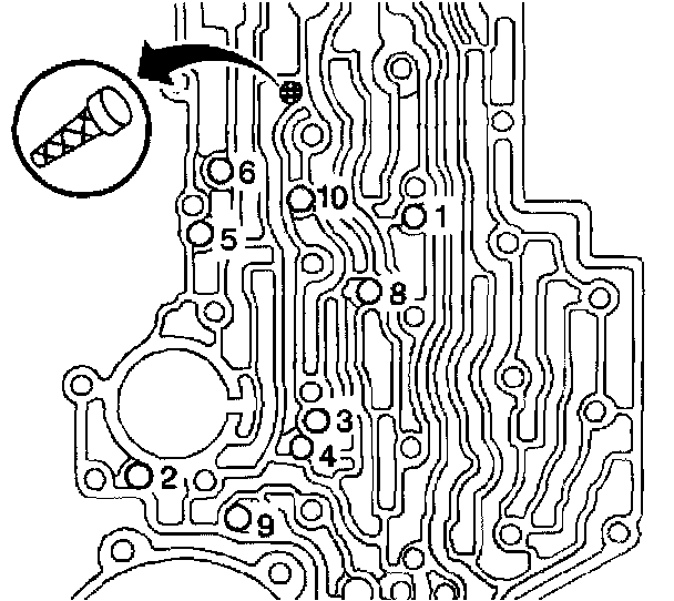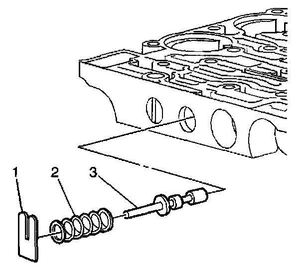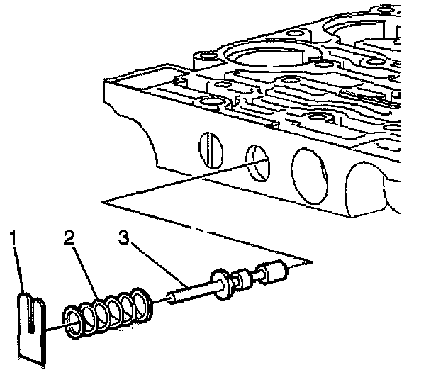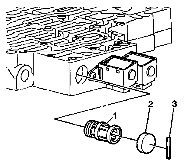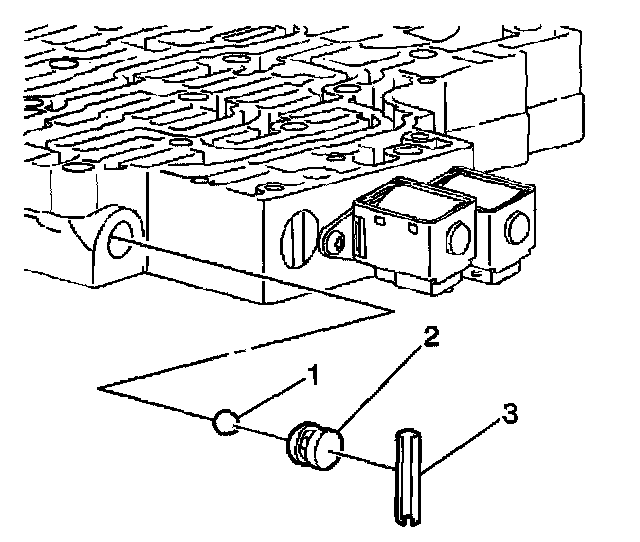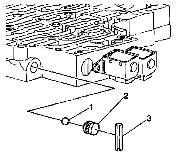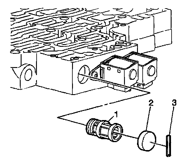 19. Remove the shift valve fluid filter bore plug pin (3).