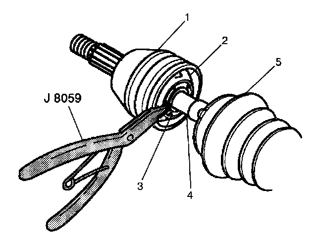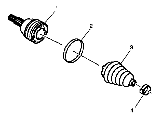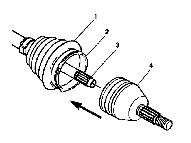 Important: Be sure that the retaining ring side of the CV joint inner race faces the halfshaft bar (3) before installation. Slide the CV joint (4) onto the halfshaft bar (3). The retaining snap ring inside of the inner race engages in the halfshaft bar groove with a click when the CV joint (4) is in the proper position.