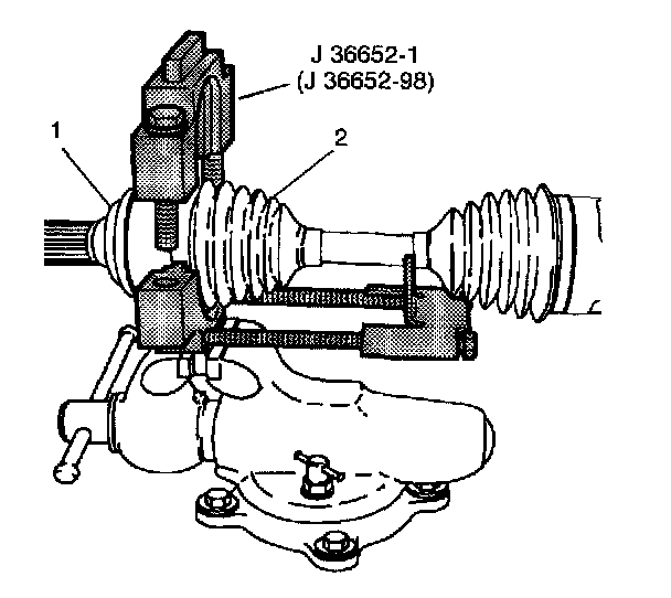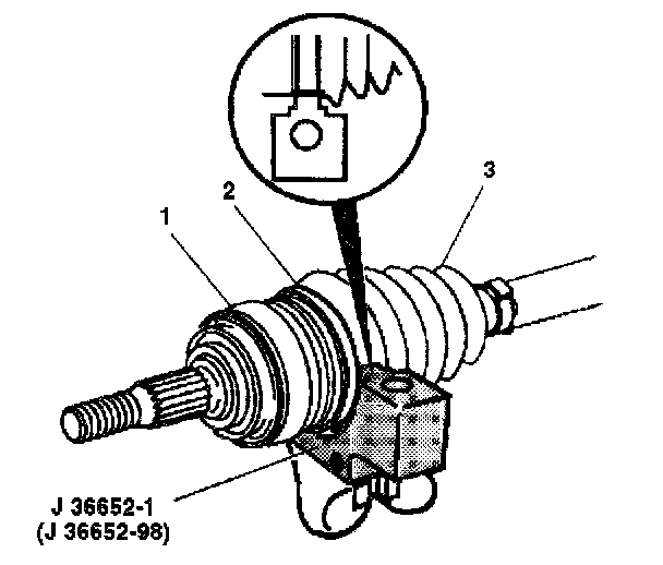 24. Install the top half of J 36652 onto the lower half of the tool, over the CV joint seal (3) and the CV joint assembly (1).