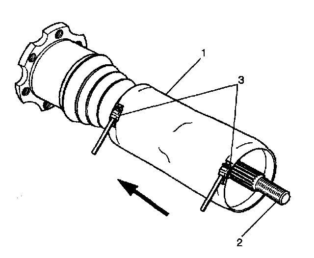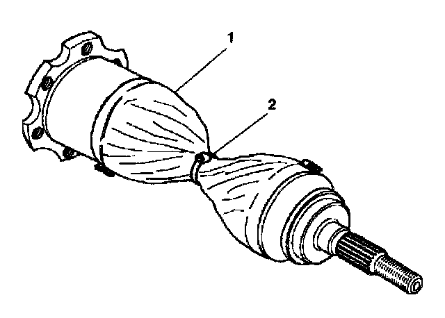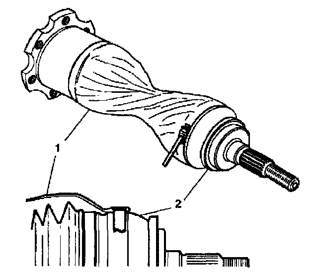 2. Slide the halfshaft seal cover (1) onto the halfshaft assembly (2), starting at the outboard (CV joint) end.