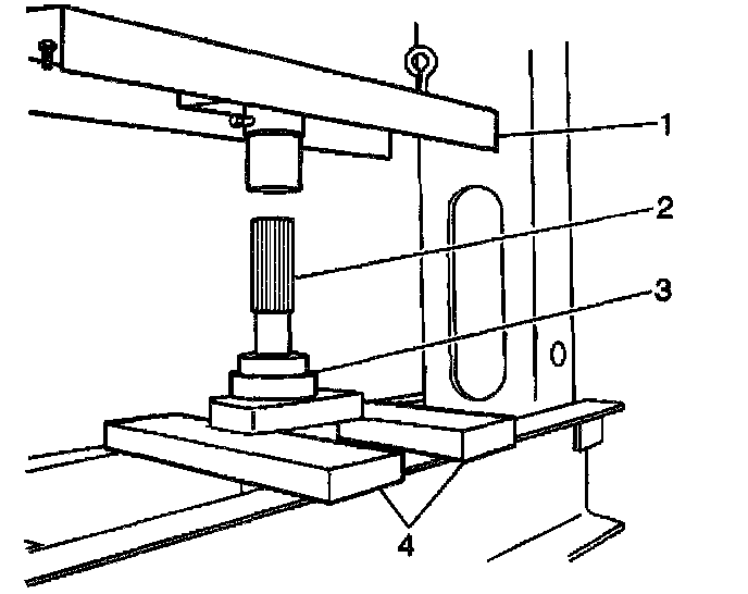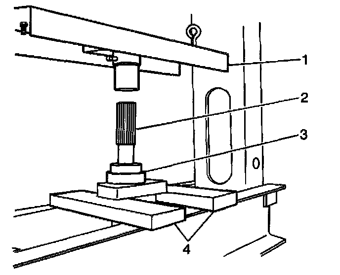 3.1. Stand the propeller shaft (2) on end in the press (1) with the center bearing (3) supported by the press bars (4).