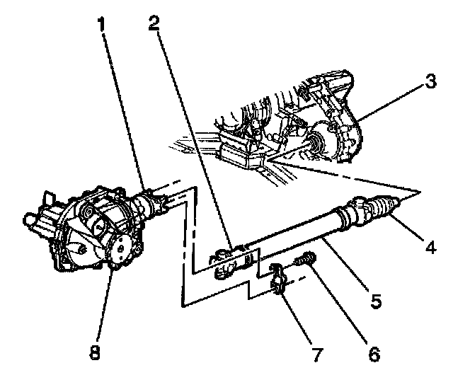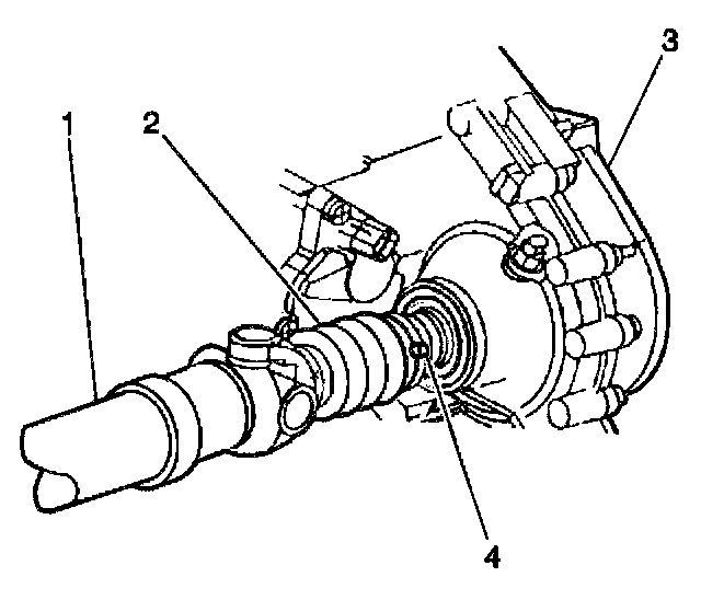 4. Remove the clamp (4) at the transfer case (3) by prying up the exposed end of the clamp (4) with a flat bladed tool.