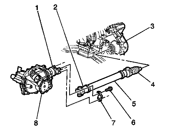 7. Remove the propeller shaft (5) from the transfer case output shaft by sliding the propeller shaft forward.