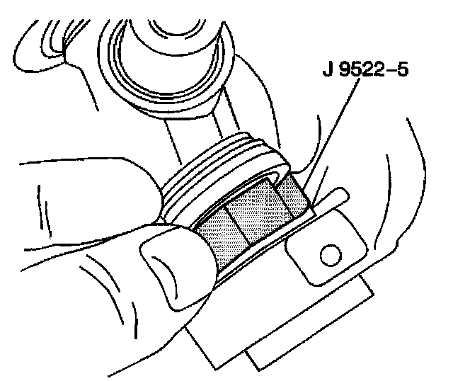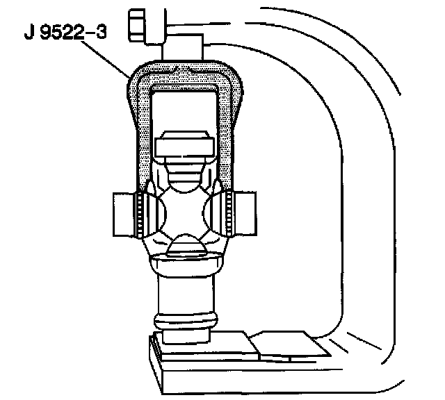 4. In order to shear the plastic retaining ring on the bearing cup, place J 9522-3 on the open horizontal bearing cups. Press the lower bearing cup out of the yoke ear.