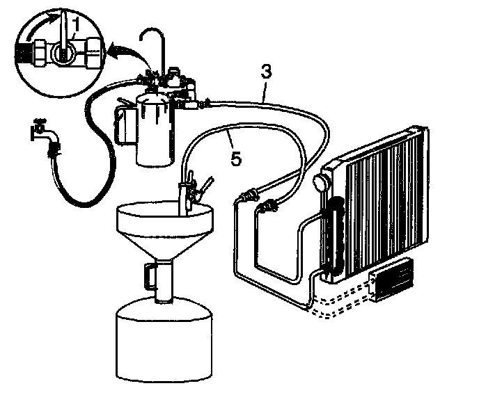2. Turn the J 35944-A water supply valve (1) to the OFF position and clip the discharge hose (5) onto a suitable container, preferably with a lid, to avoid splash back.