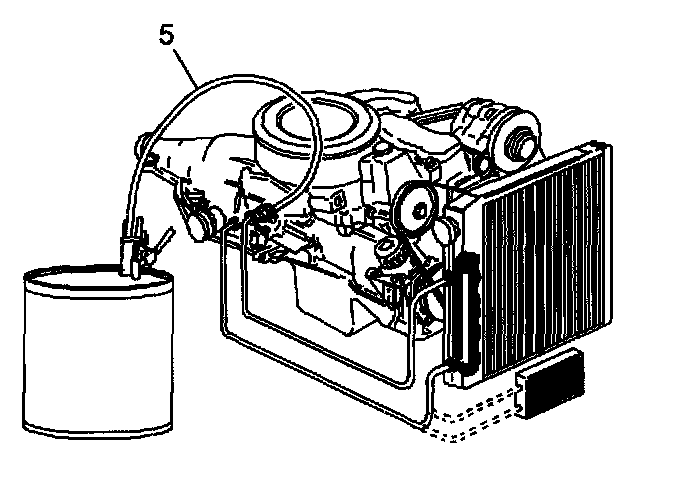 1. Disconnect both hoses from the oil cooler pipes. Connect the oil cooler feed pipe (bottom connector) to the transmission. Connect the return pipe (top connector) to the discharge hose (5). (This will require the use of J-44835-1) Clip the discharge hose (5) onto an empty oil drain container.