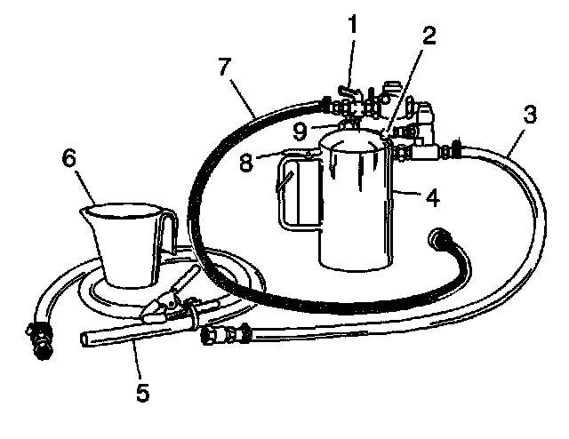 3. Install the fill cap (9) on the J 35944-A and pressurize the flusher tank (4) to 550 - 700 kPa (80 - 100 psi), using the shop air supply at the tank air valve (9).