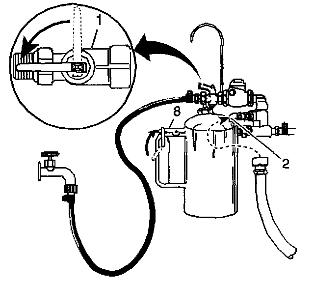 4. Turn the J 35944-A water supply valve (1) to the OFF position and turn OFF the water supply at the faucet.