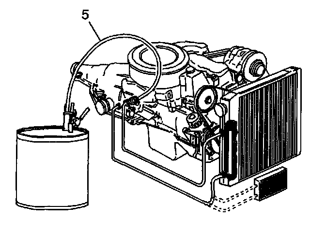 1. Disconnect both hoses from the oil cooler pipes. Connect the oil cooler feed pipe (bottom connector) to the transmission and the return pipe (top connector) (May require J 35944-200) to the discharge hose (5). Clip the discharge hose (5) onto the empty oil drain container.