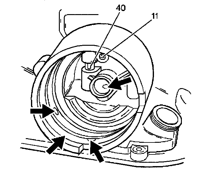 3. Inspect the 2-4 servo bore, the 3rd accumulator retainer and ball assembly (40), the orifice cup plug (11) in the servo bore, and the 2nd apply piston pin bore for any of the following conditions: