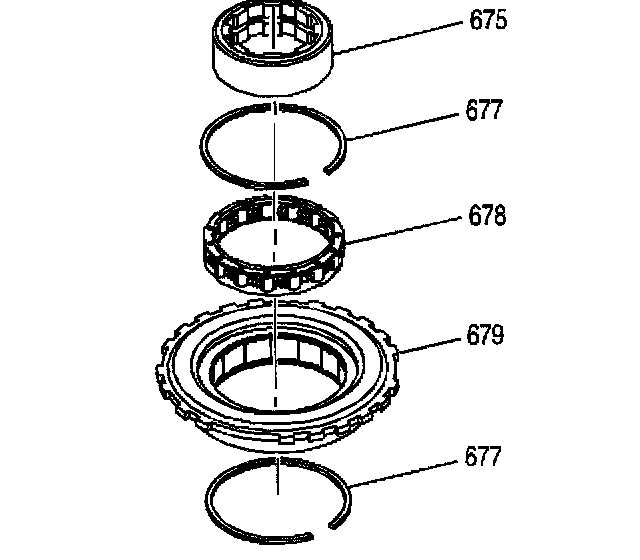2. Remove the low and reverse roller retainer ring (677) and the low and reverse roller clutch assembly (678). Inspect the roller clutch assembly for damaged rollers and broken springs.