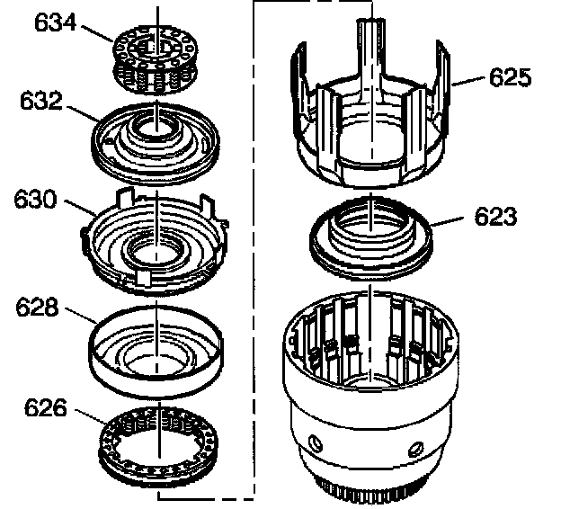 1. Remove the reverse input clutch housing and drum assembly (605) from the input clutch assembly (621).