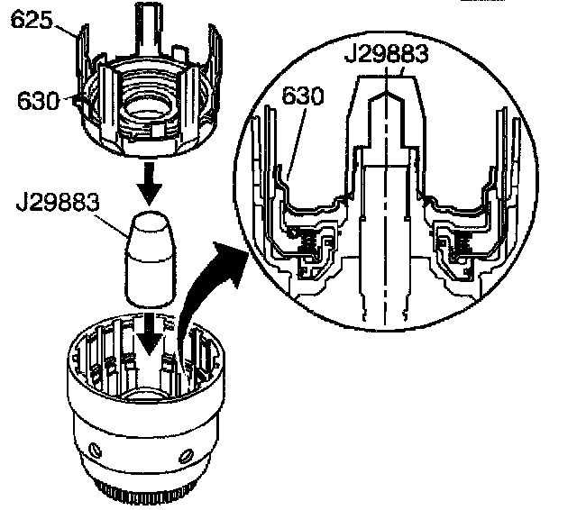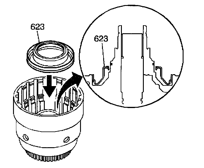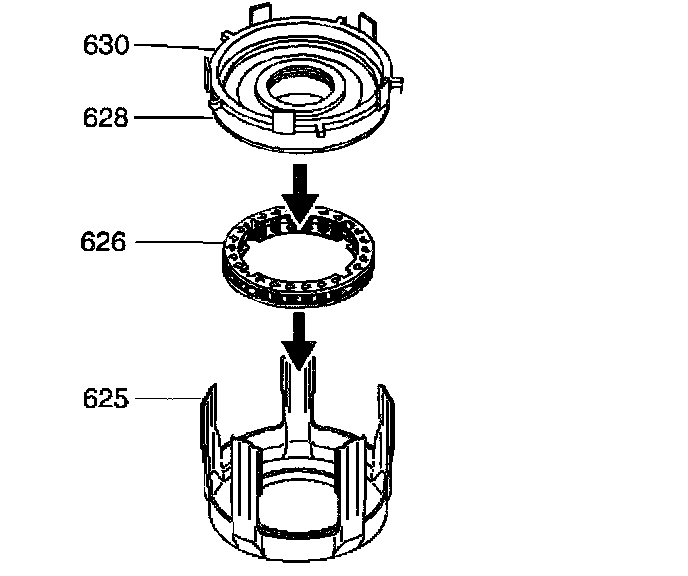 ^ Hold the assembly by the 3rd and 4th clutch apply ring (625) legs during installation.