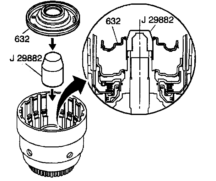 Important: The forward clutch piston (630) apply legs must be indexed with the 3rd and 4th clutch apply ring (625) legs.