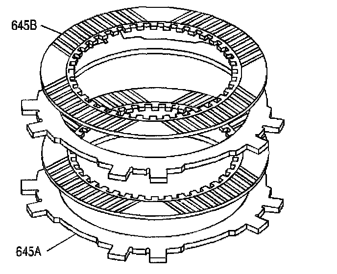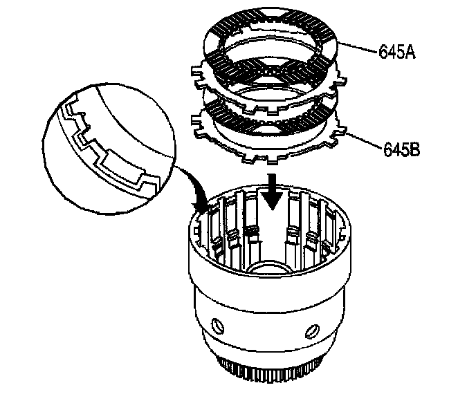 2. Install the overrun clutch plates into the input housing starting with a steel plate (64513) and alternating with fiber plate assemblies (645A).