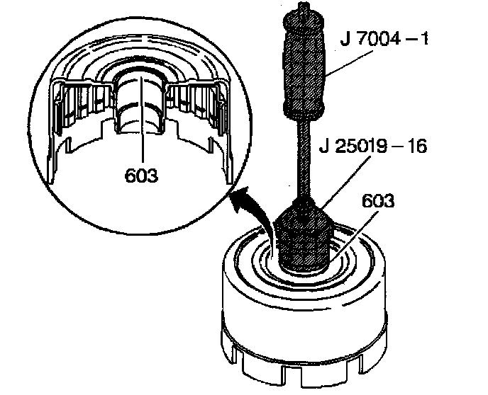 2. Using the J 25019-16 with the J 7004-1, remove the reverse input clutch front bushing (603).