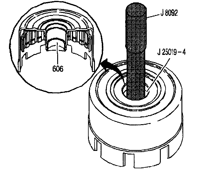 3. Using the J 25019-4 with the J 8092, remove the reverse input clutch rear bushing (606).