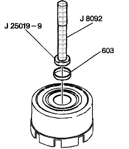 1. Using the J 25019-9 with the J 8092, install a reverse input clutch front bushing (603).