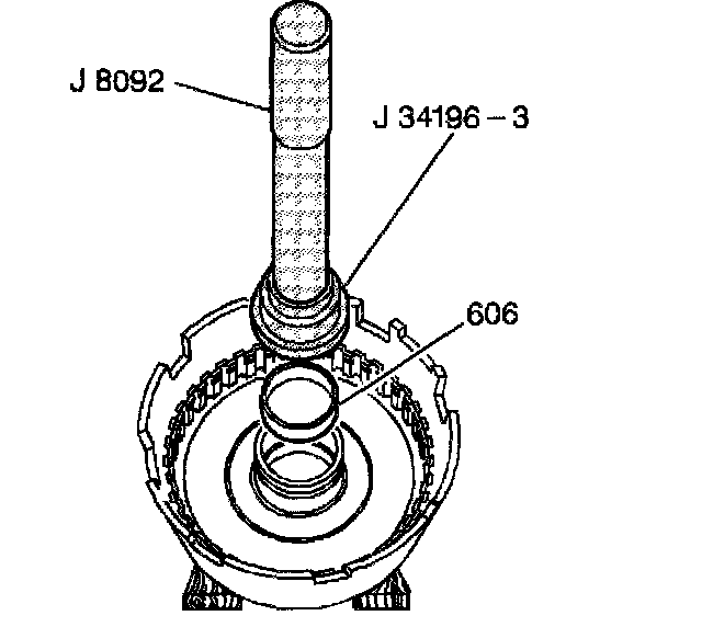 2. Using the J 34196-3 with the J 8092, install a reverse input clutch rear bushing (606).