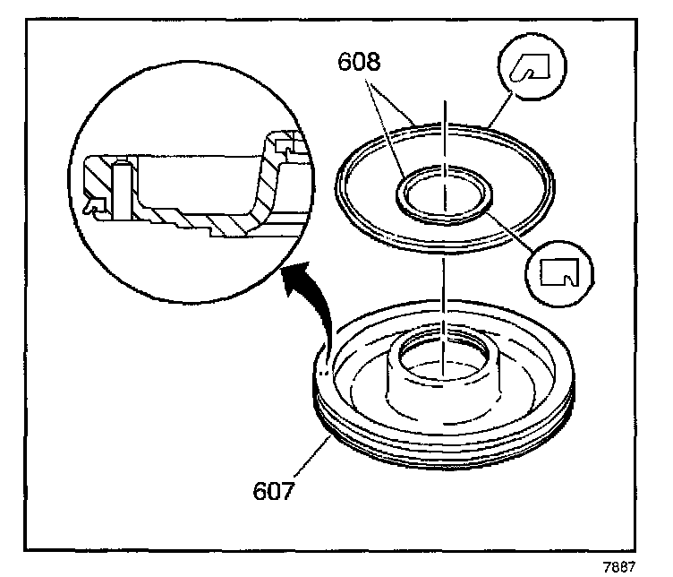 2. Install the reverse input clutch inner and outer seals (608) on the piston.