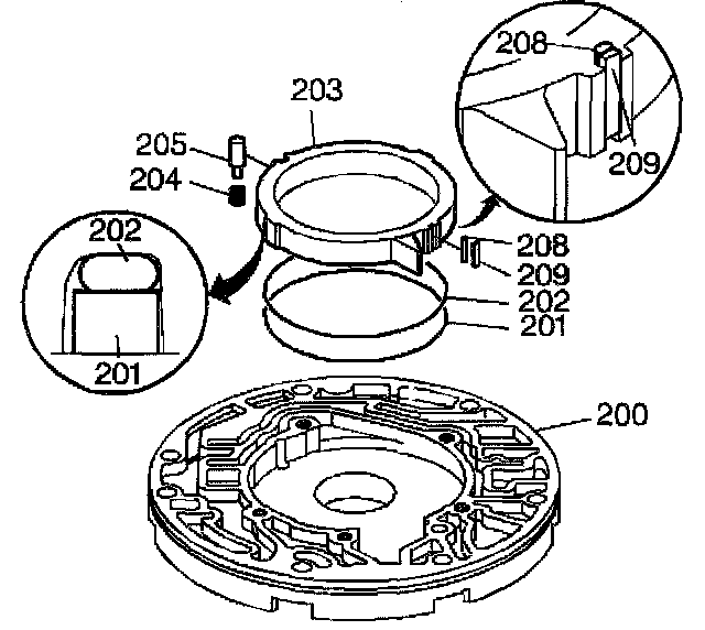3. Install an O-ring seal (202) and oil seal ring (201) into the groove on the back side of the pump slide (203).