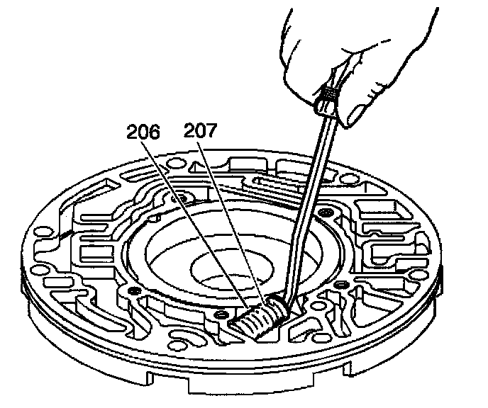7. Index the slide notch with the pivot pin (205). The oil seal ring must face downward into the pump pocket.